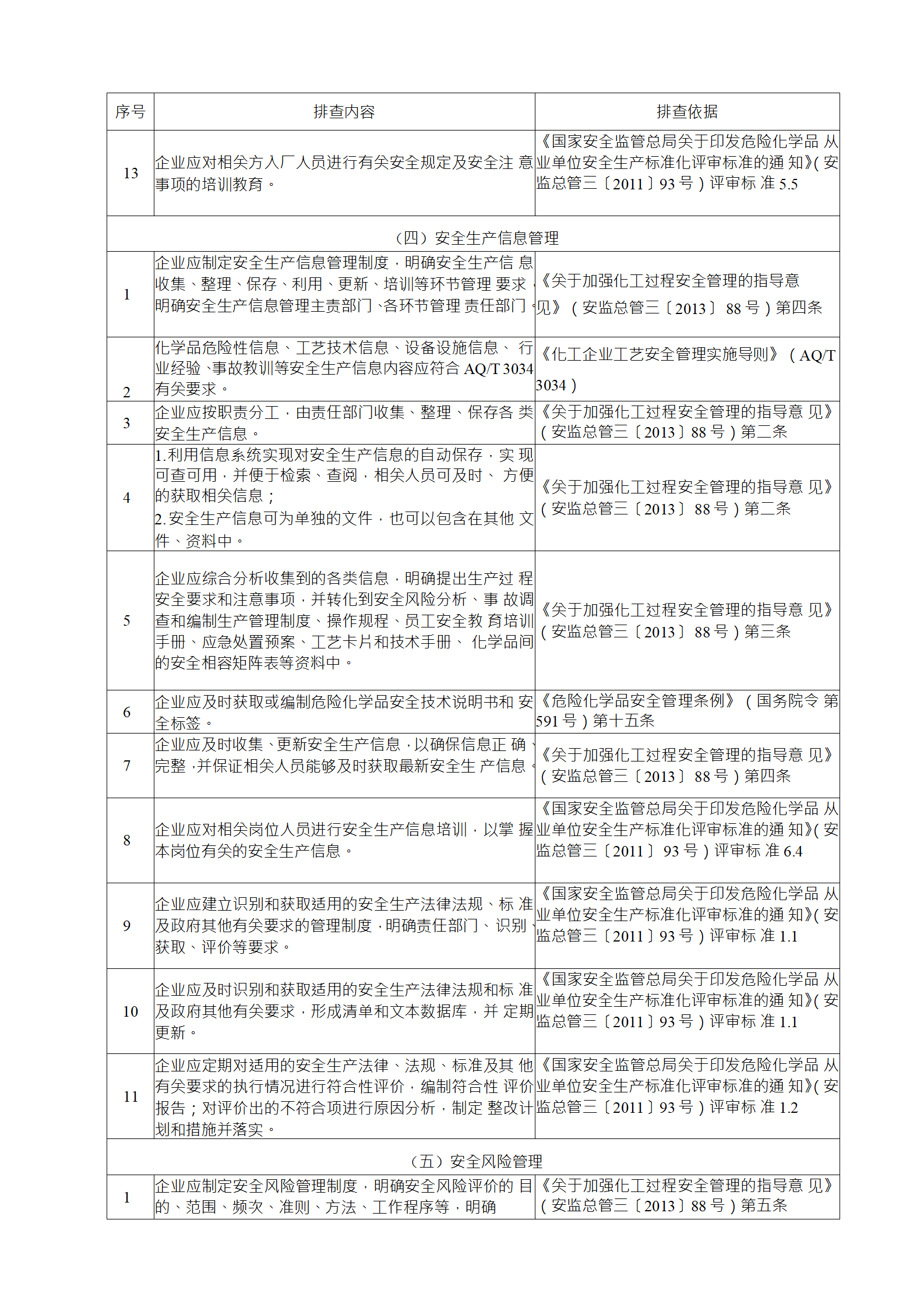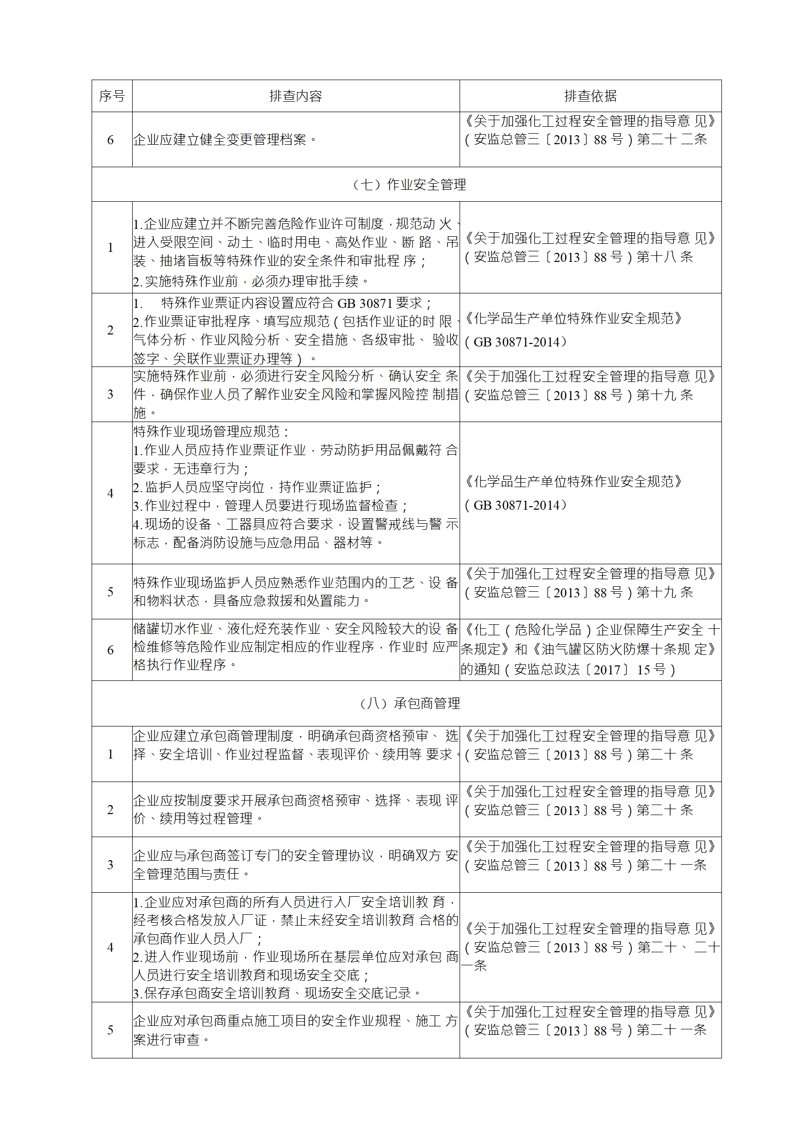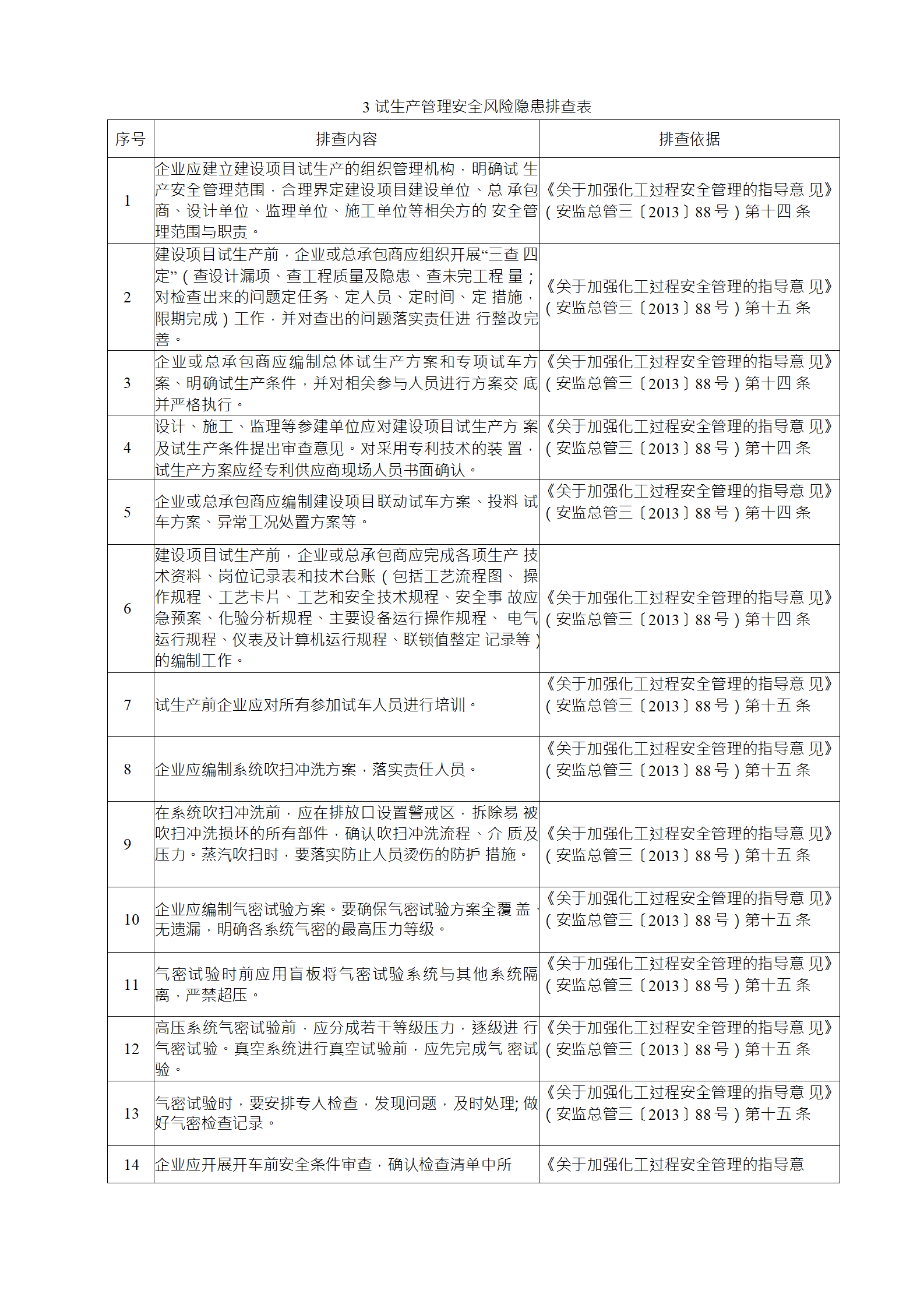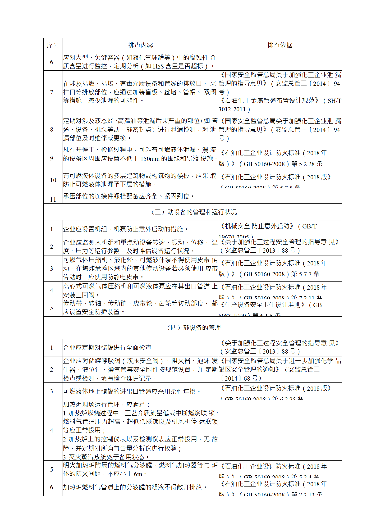 企業(yè)應(yīng)結(jié)合自身安全風(fēng)險及管控水平,按照化工過程安全 管理的要求,參照各專業(yè)安全風(fēng)險隱患排查表(見附件),編制 符合自身實(shí)際的安全風(fēng)險隱患排查表,開展安全風(fēng)險隱患排查 工作。