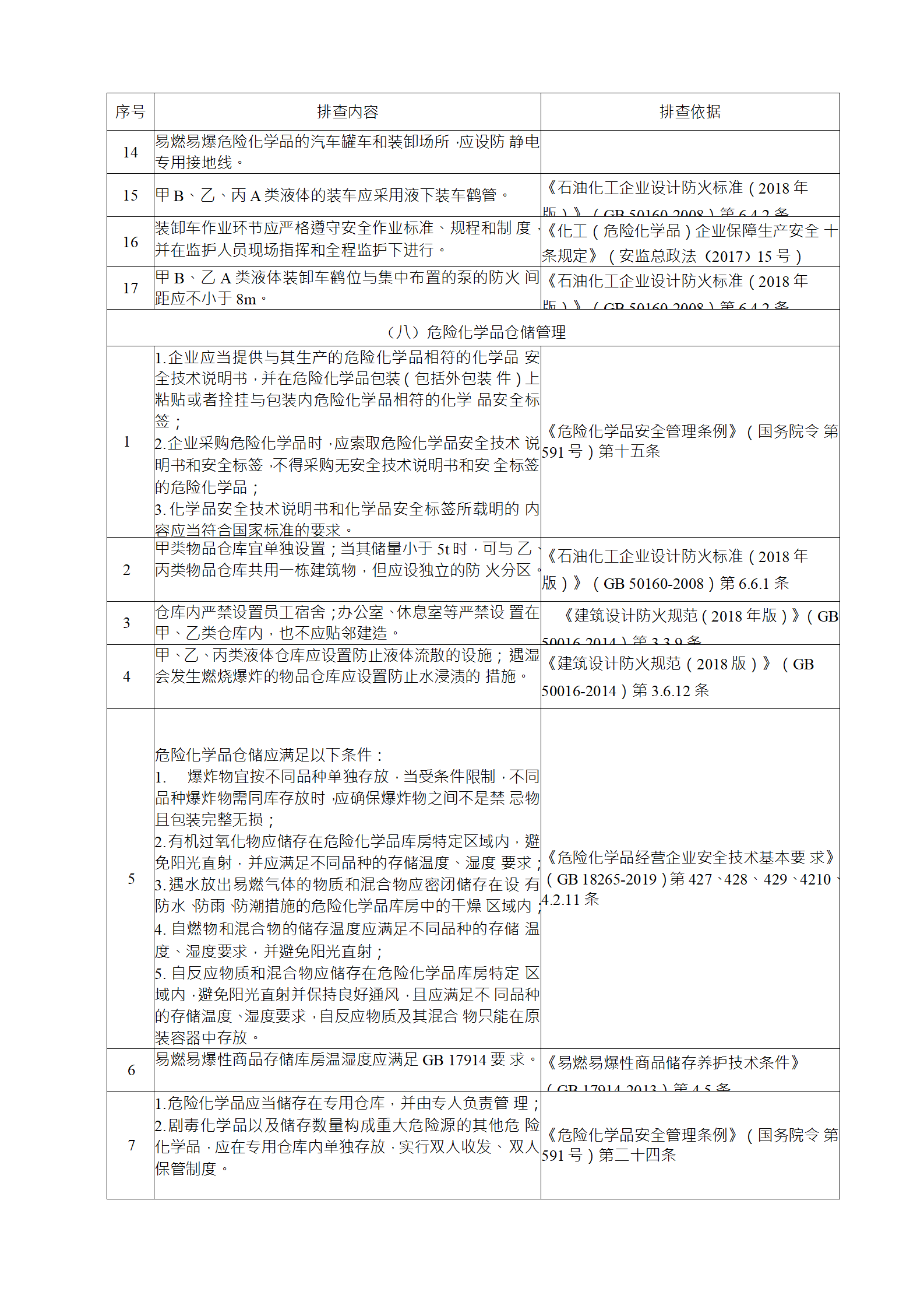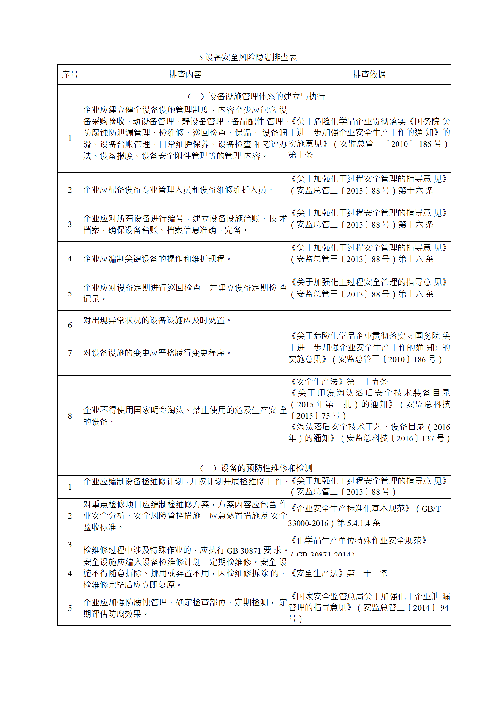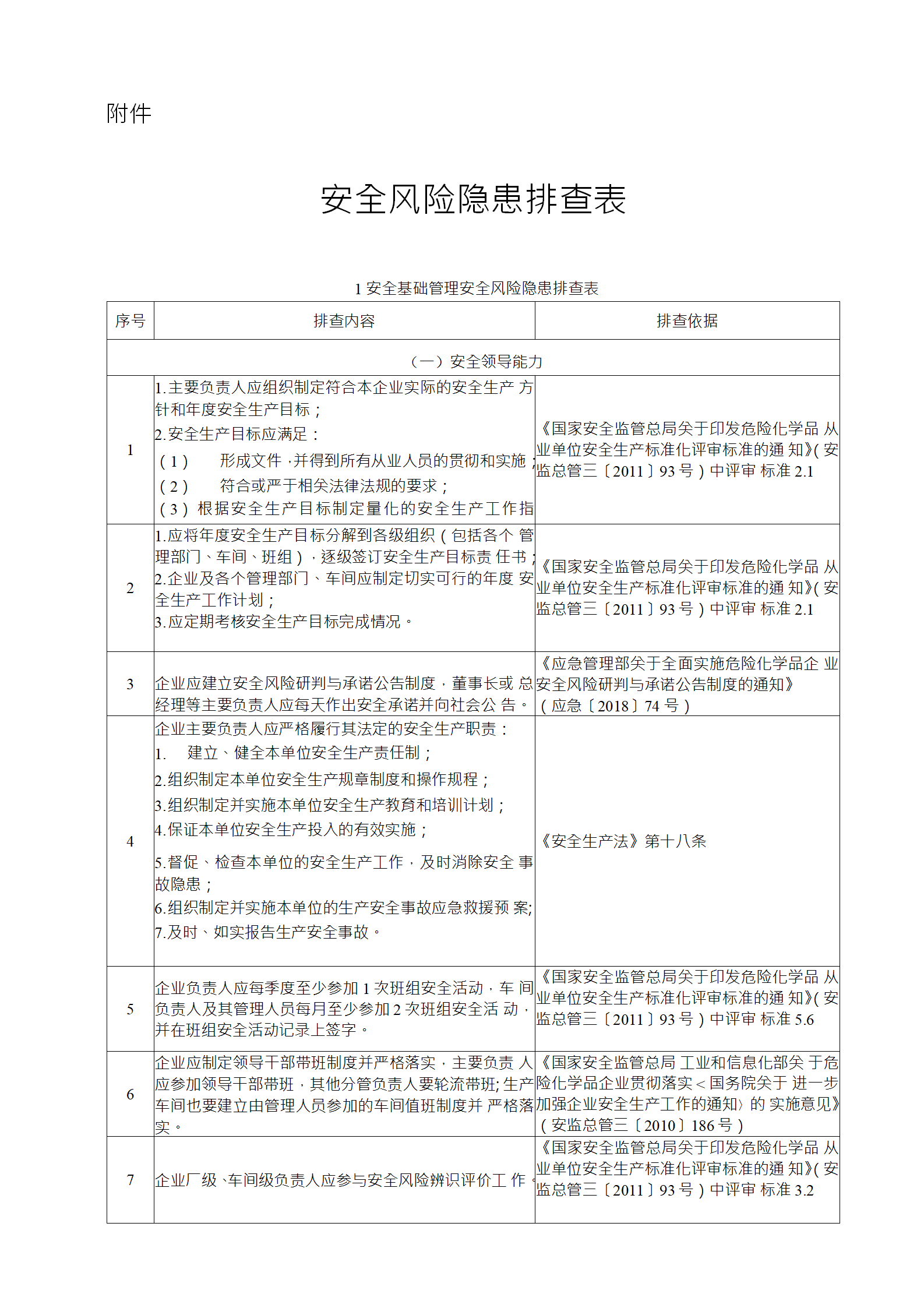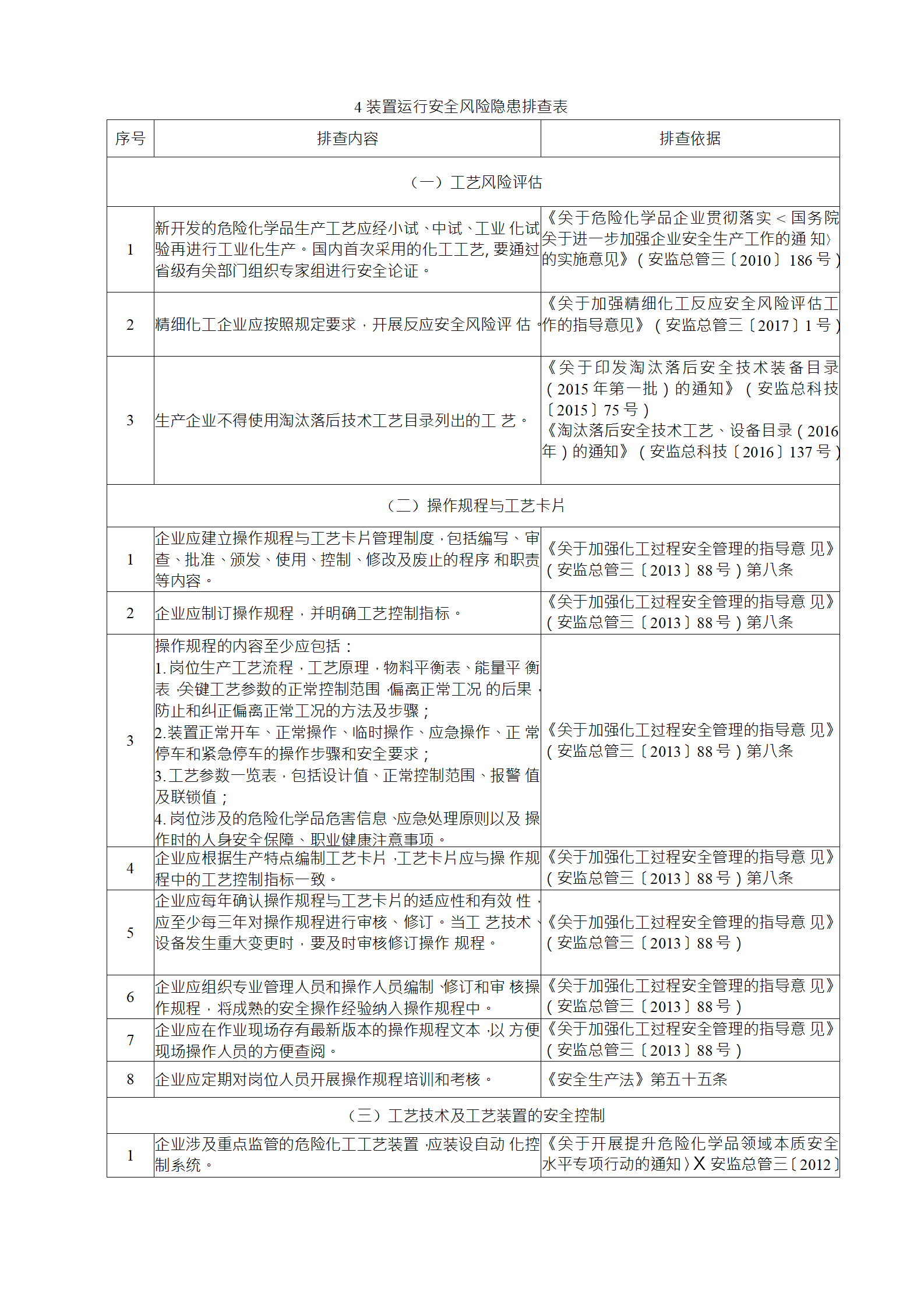 企業(yè)應(yīng)結(jié)合自身安全風(fēng)險及管控水平,按照化工過程安全 管理的要求,參照各專業(yè)安全風(fēng)險隱患排查表(見附件),編制 符合自身實(shí)際的安全風(fēng)險隱患排查表,開展安全風(fēng)險隱患排查 工作。