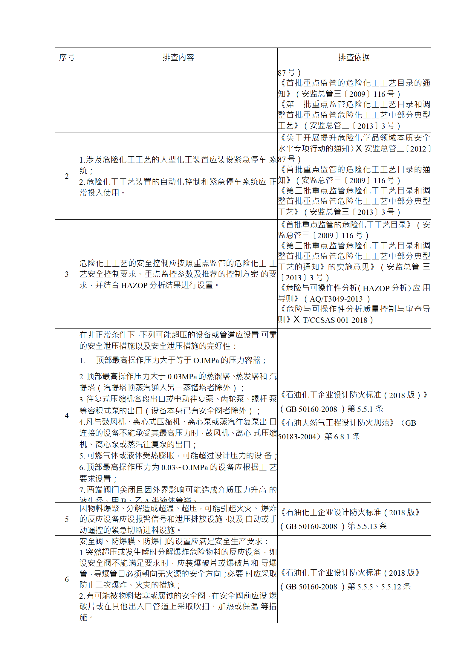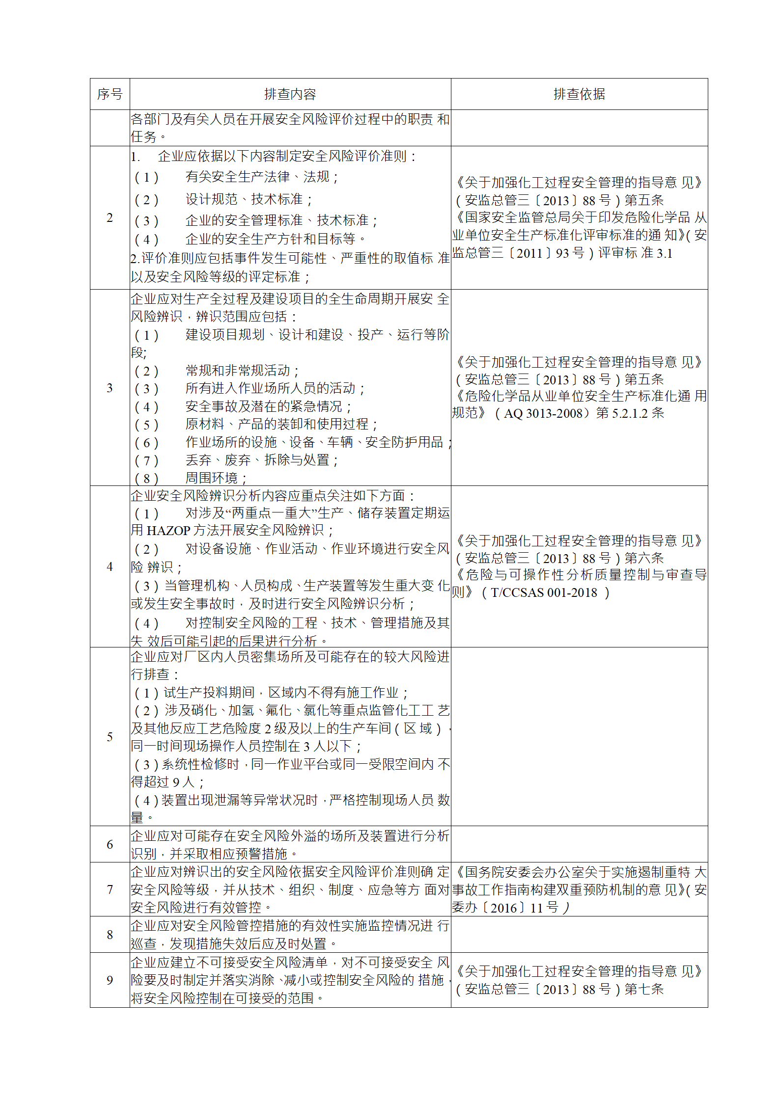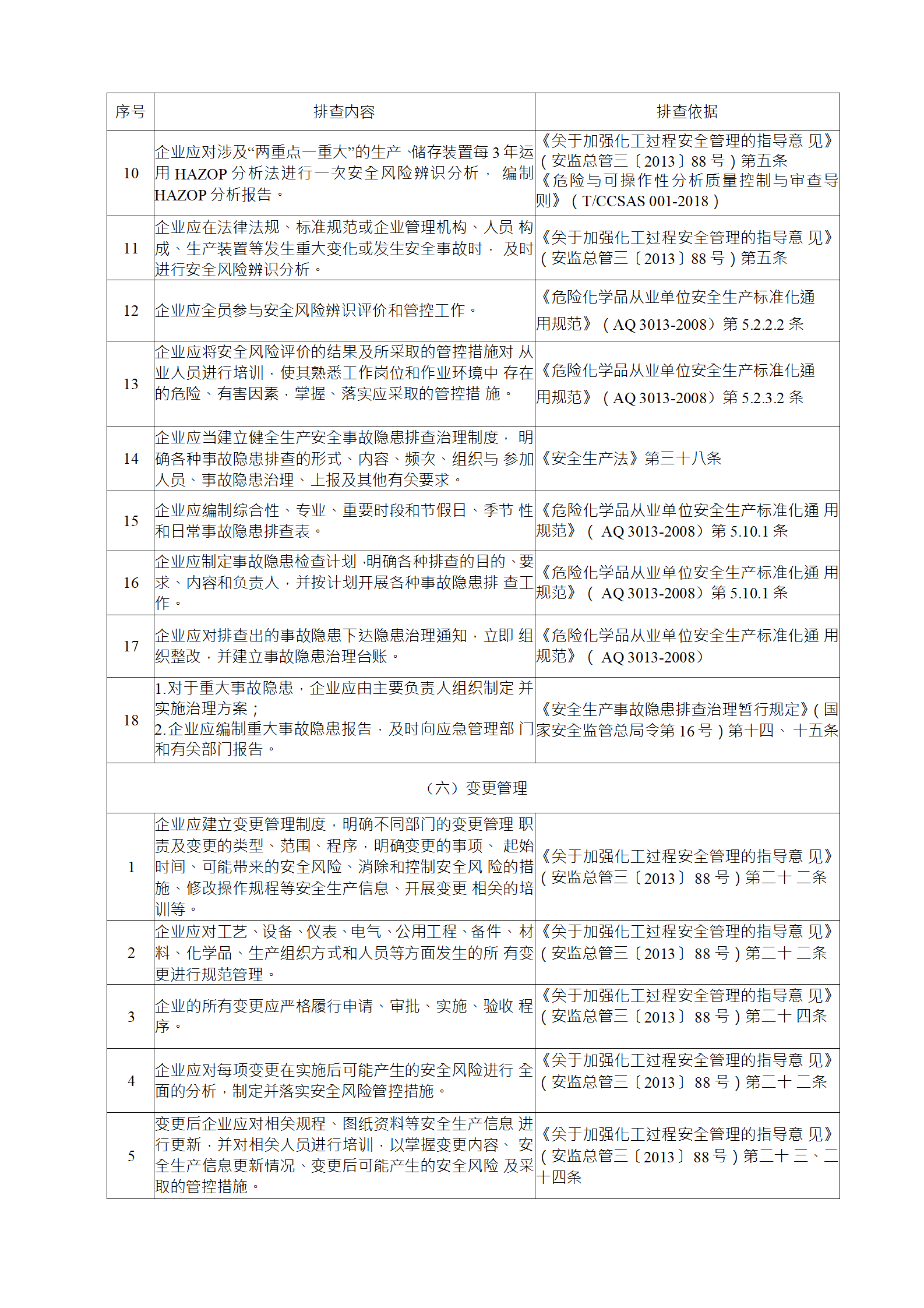 3.1.1 企業(yè)應(yīng)根據(jù)安全生產(chǎn)法律法規(guī)和安全風(fēng)險管控情況, 按照化工過程安全管理的要求,結(jié)合生產(chǎn)工藝特點(diǎn),針對可能發(fā)生安全事故的風(fēng)險點(diǎn),全面開展安全風(fēng)險隱患排查工作,做 到安全風(fēng)險隱患排查全覆蓋,責(zé)任到人。