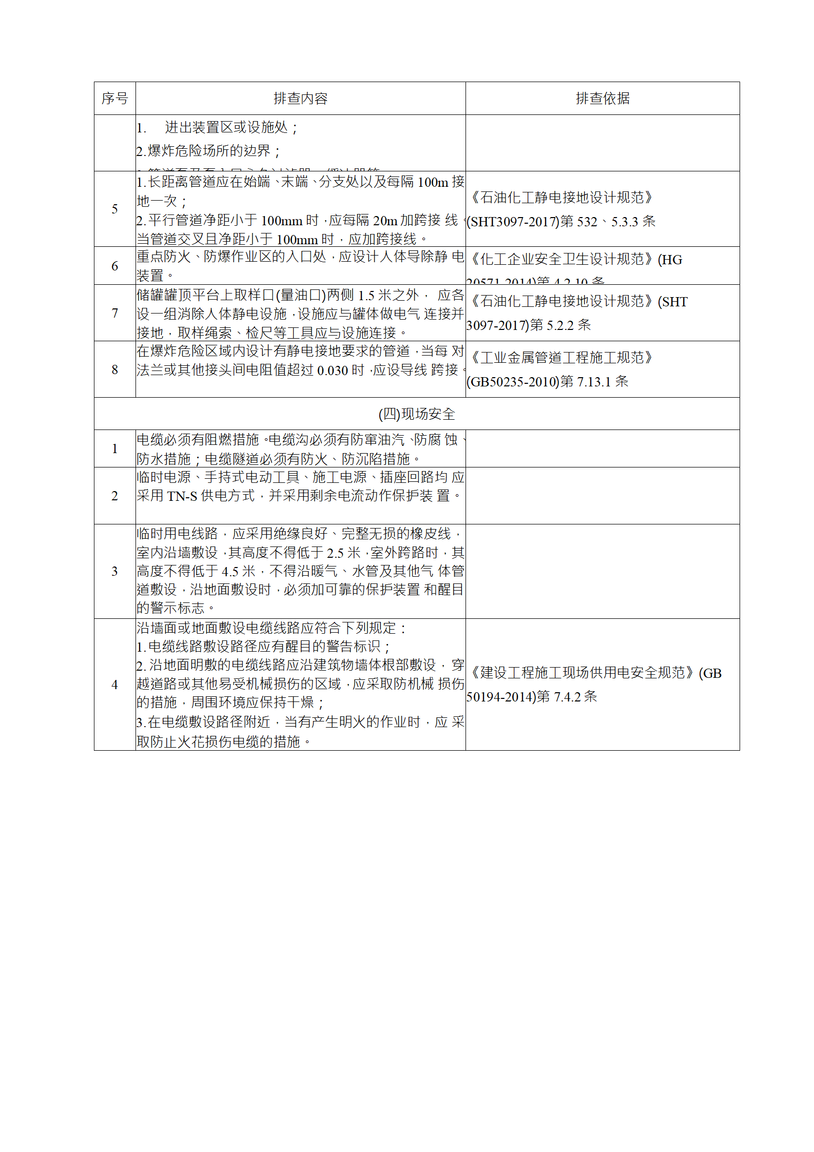 (4)季節(jié)性排查是指根據(jù)各季節(jié)特點(diǎn)開展的專項檢查,主要包括:春季以防雷、防靜電、防解凍泄漏、防解凍坍塌為重 點(diǎn);夏季以防雷暴、防設(shè)備容器超溫超壓、防臺風(fēng)、防洪、防 暑降溫為重點(diǎn);秋季以防雷暴、防火、防靜電、防凝保溫為重 點(diǎn);冬季以防火、防爆、防雪、防凍防凝、防滑、防靜電為重 點(diǎn);