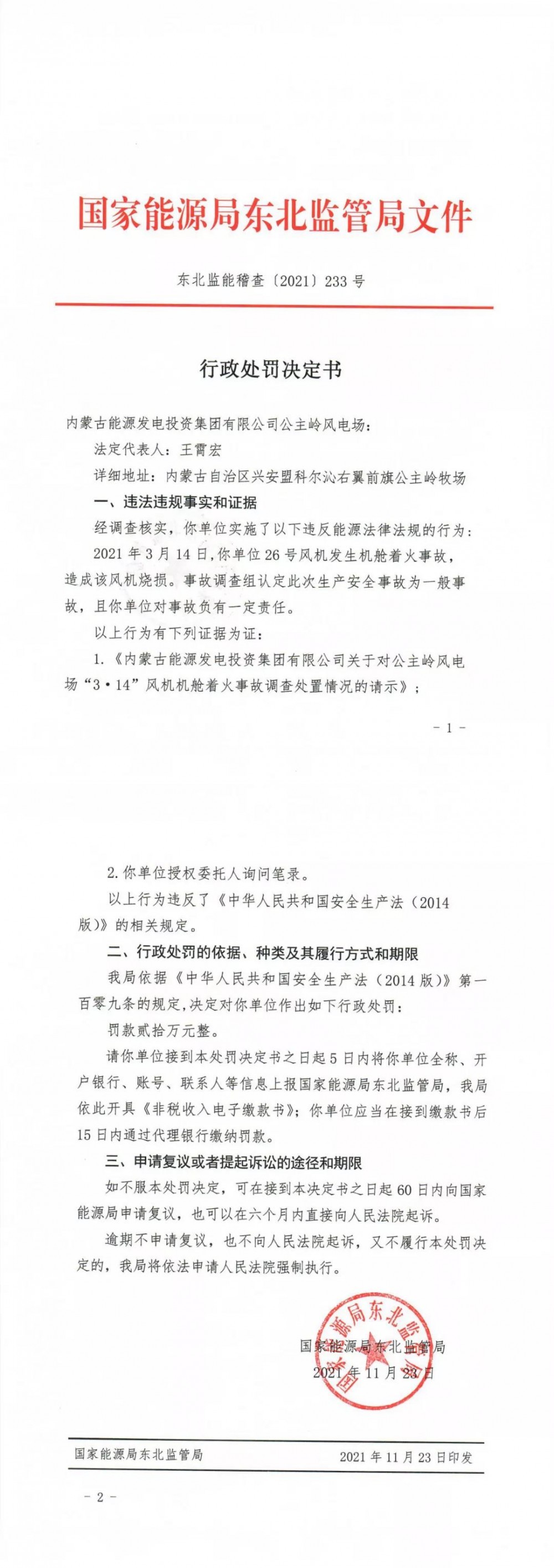 國(guó)家能源局東北監(jiān)管局通報(bào)內(nèi)蒙古公主嶺風(fēng)場(chǎng)“3.14”風(fēng)機(jī)著火事故的處罰