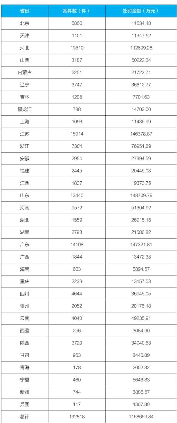 行政處罰案件數(shù)量排名前五的省份為:河北、江蘇、廣東、山東、河南。罰款金額排名前五的省份為:山東、廣東、江蘇、河北、浙江。