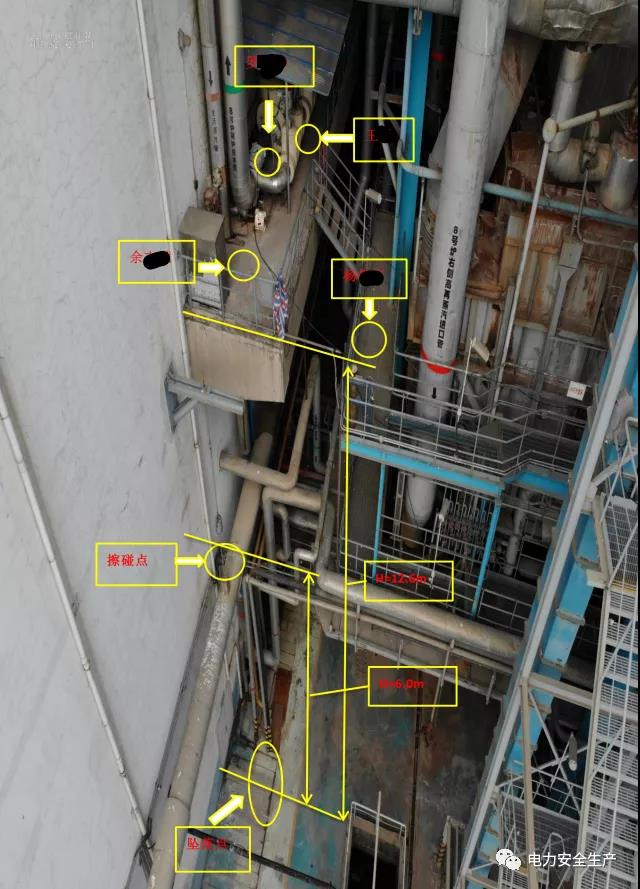 4.現(xiàn)場(chǎng)核查,主給水放水管已完全斷裂,下部水泥平臺(tái)被擊穿,臨近的滑動(dòng)支架被高壓水汽吹脫至靠汽機(jī)房墻面,注膠槍與夾具脫開(kāi),吹至靠汽機(jī)房墻面。給水平臺(tái)頂端下部懸空冷再供熱母管保溫外護(hù)板有明顯碰撞變形痕跡,和余某某事故中躲避位置、事故后墜落位置對(duì)應(yīng)。