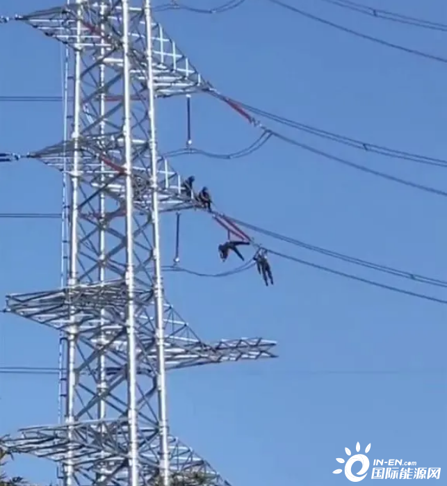 網(wǎng)友拍攝的視頻內(nèi)容顯示,在一道路附近的高壓線桿上,兩名人員的身體懸掛在線纜上一動(dòng)不動(dòng),疑似發(fā)生觸電事故,一旁則是架設(shè)的高壓電力設(shè)施。極目新聞?dòng)浾咦⒁獾?,兩名人員身穿黑色衣服,頭戴安全帽,因事發(fā)地位于道路交叉口,附近來往行人和車輛較多,不時(shí)有市民在一旁圍觀。