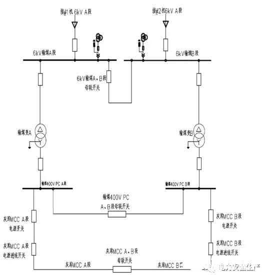 輸煤系統(tǒng)6kV電源設(shè)計(jì)A、B兩段母線,單母線分段運(yùn)行,母聯(lián)開(kāi)關(guān)熱備用。輸煤配電室內(nèi)布置兩臺(tái)400V輸煤廠用變壓器,高壓側(cè)分別接6kV電源母線A段、B段,低壓側(cè)接輸煤400V母線A段、B段,兩段分段運(yùn)行,母聯(lián)開(kāi)關(guān)熱備用。