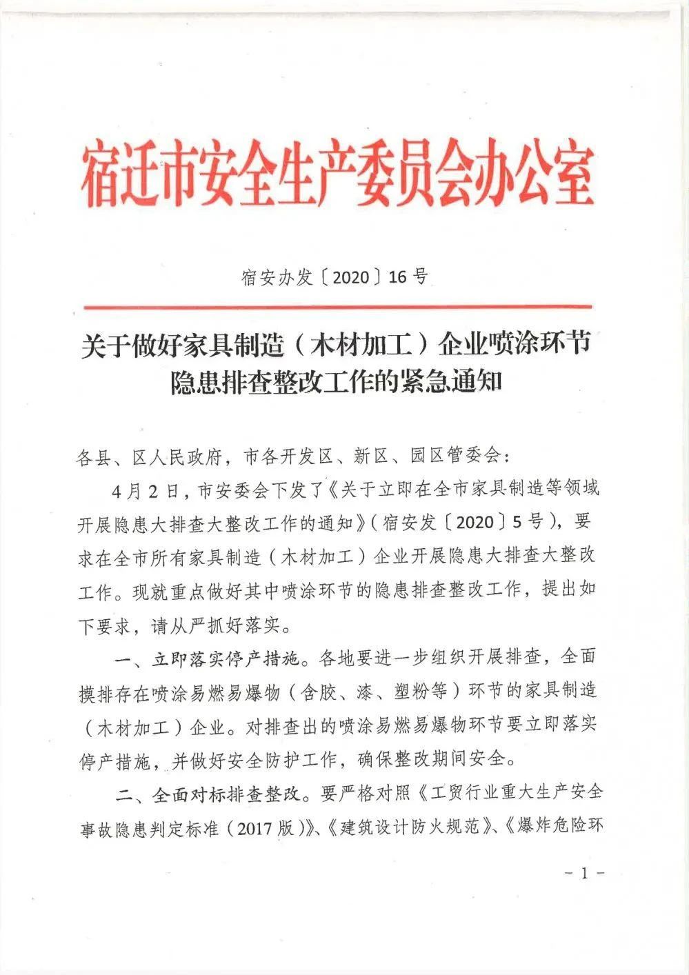 宿遷安監(jiān)消息:近日,宿遷市安委會連續(xù)發(fā)出5號、6號文件,安委辦發(fā)出16號文件,要求開展專項治理。安委辦16號文件特別提出要重點做好家具制造噴涂環(huán)節(jié)的隱患排查整改工作。