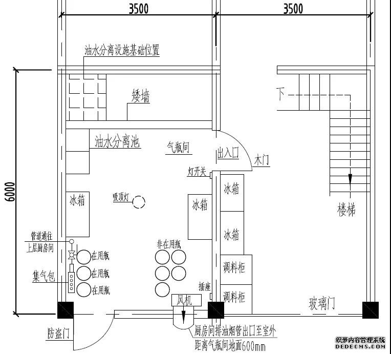 廚房間設(shè)置在氣瓶間樓上(東側(cè)建筑的二樓),南側(cè)由西往東依次擺放:雙眼炒灶、不銹鋼雙層工作臺(tái)、蒸煮爐、單頭矮仔爐、湯爐、頂上吊不銹鋼煙罩;東側(cè)由南向北依次擺放:蒸包子爐、不銹鋼水槽等。廚房間內(nèi)燃?xì)忮冧\鋼管從一樓氣瓶間西南角立管延伸至二樓廚房間,沿踢腳線敷設(shè)鍍鋅鋼管,管上裝有6個(gè)”三通”,通過(guò)“三通”和支管閥門連接燃?xì)庀鹉z軟管直供雙眼炒灶1臺(tái),其他燃器具依次由DN25鍍鋅鋼管(輸氣總管)經(jīng)“三通”及角閥與家用調(diào)壓器連接二次減壓后,分別通到蒸煮爐2臺(tái)、單頭矮仔爐2臺(tái)、湯爐1臺(tái)、蒸包子爐1臺(tái)使用。二. 事故發(fā)生