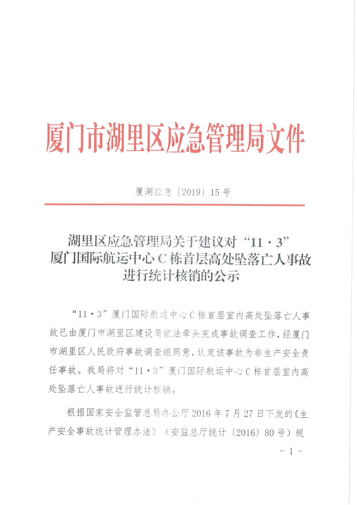 湖里區(qū)應(yīng)急管理局關(guān)于建議對“11·3”廈門國際航運中心C棟首層高處墜落亡人事故進(jìn)行統(tǒng)計核銷的公示