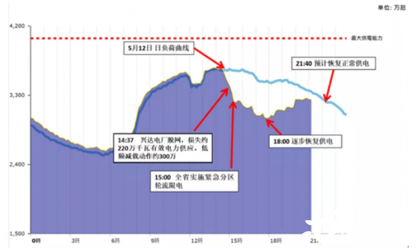 5月13日14時(shí)37分,興達(dá)電廠因接入345千伏路北變電站母線故障,導(dǎo)致電廠電力送出受阻,兩臺(tái)燃煤及兩臺(tái)燃?xì)鈾C(jī)組脫網(wǎng),系統(tǒng)損失有效電力供應(yīng)約220萬千瓦,造成臺(tái)灣系統(tǒng)頻率驟降,為維持電網(wǎng)穩(wěn)定,電力系統(tǒng)在第一時(shí)間自動(dòng)啟動(dòng)低頻卸載約300萬千瓦。臺(tái)電評(píng)估短時(shí)間內(nèi)無法立即復(fù)電,為維系電力系統(tǒng)安全,自下午3時(shí)起執(zhí)行緊急分區(qū)輪流停電,最大限電達(dá)到350萬千瓦。事故過程系統(tǒng)負(fù)荷變化曲線下圖所示。