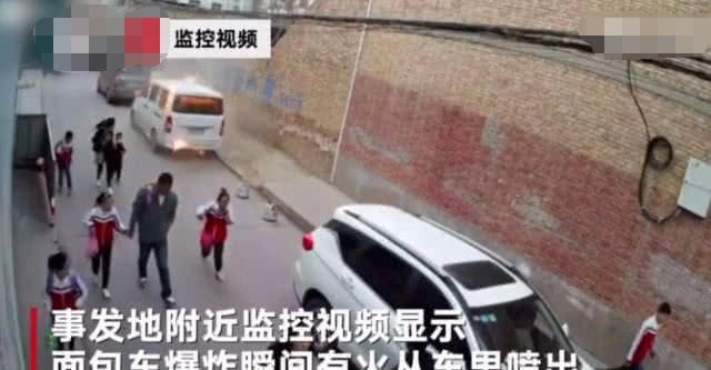 事發(fā)地附近監(jiān)控顯示,面包車爆炸瞬間有火從車里噴出,而在爆炸前一秒小學(xué)生剛剛從車旁經(jīng)過。