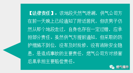 某男在早上散步過(guò)程中,地下天然氣爆炸造成死亡。頭一天晚上11點(diǎn)就知道該區(qū)域有天然氣泄漏,燃?xì)夤疽呀?jīng)提前通知了附近居民。