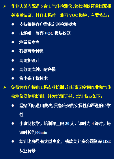 方案二 | (4)泵吸式4合1氣體檢測儀 (5)《授權(quán)氣體檢測員培訓》+《密閉空間作業(yè)安全培訓》 贈送2名工人的“密閉空間作業(yè)安心包”產(chǎn)品。 |